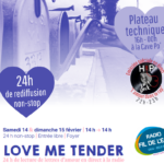- Love me tender – 24h de lectures de lettres d’amour en directRevoici Love me tender, une émission de radio unique au Monde : 24 h non-stop de lectures de lettres d’amour en public depuis la Cave Po’[…]